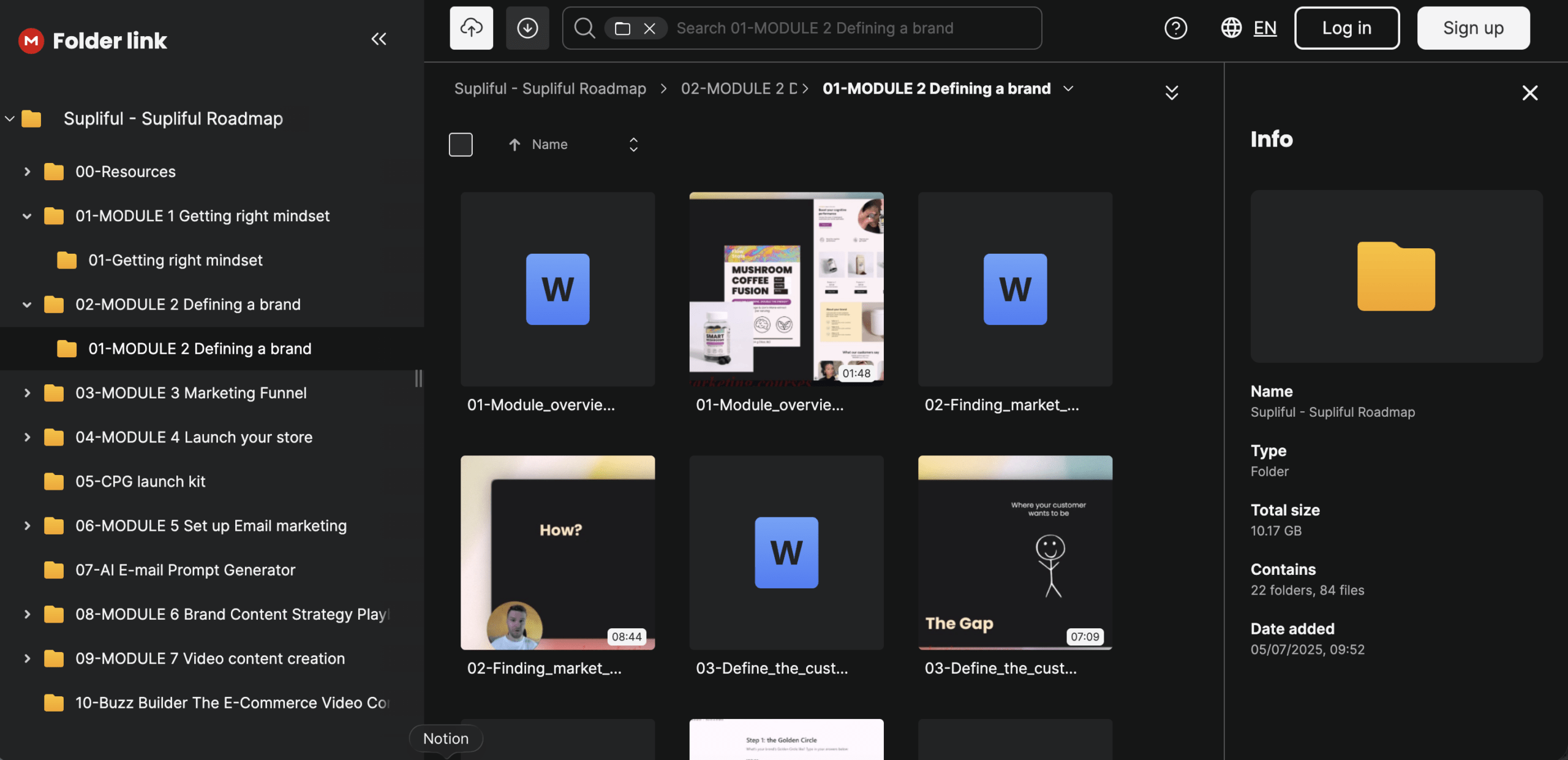 8 sequential modules: 1-Mindset, 2-Brand Positioning, 3-Marketing Funnel, 4-Shopify Setup, 5-Email Marketing, 6-Facebook Ads, 7-Customer Acquisition, 8-Operations; each with videos/homework for 14-day rollout.