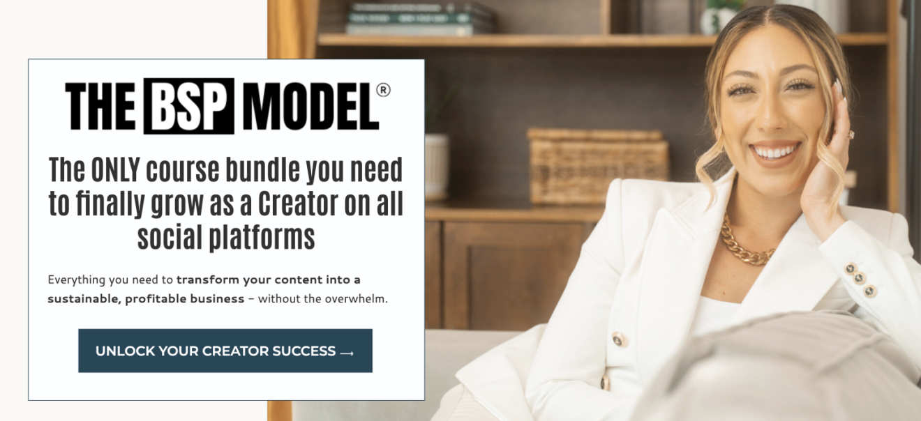 The BSP Model by Modern Millie is a 9+ course bundle totaling 36+ hours of training with action items and templates designed for aspiring content creators looking to build a powerful personal brand, grow organically on major platforms, diversify income streams, and create sustainable businesses.